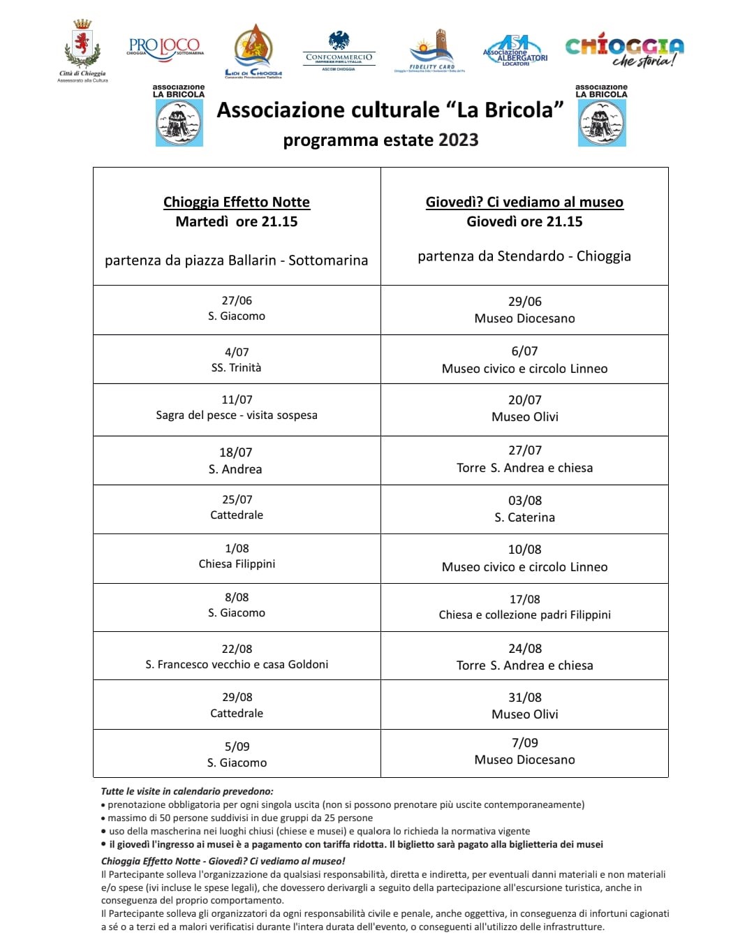 La prenotazione delle visite del martedì e del giovedì si effettuano registrandosi al sito www.eventbrite.it (digitando “La Bricola Chioggia” e poi scegliendo “Chioggia Effetto Notte” o “Giovedì? Ci vediamo al museo!”).